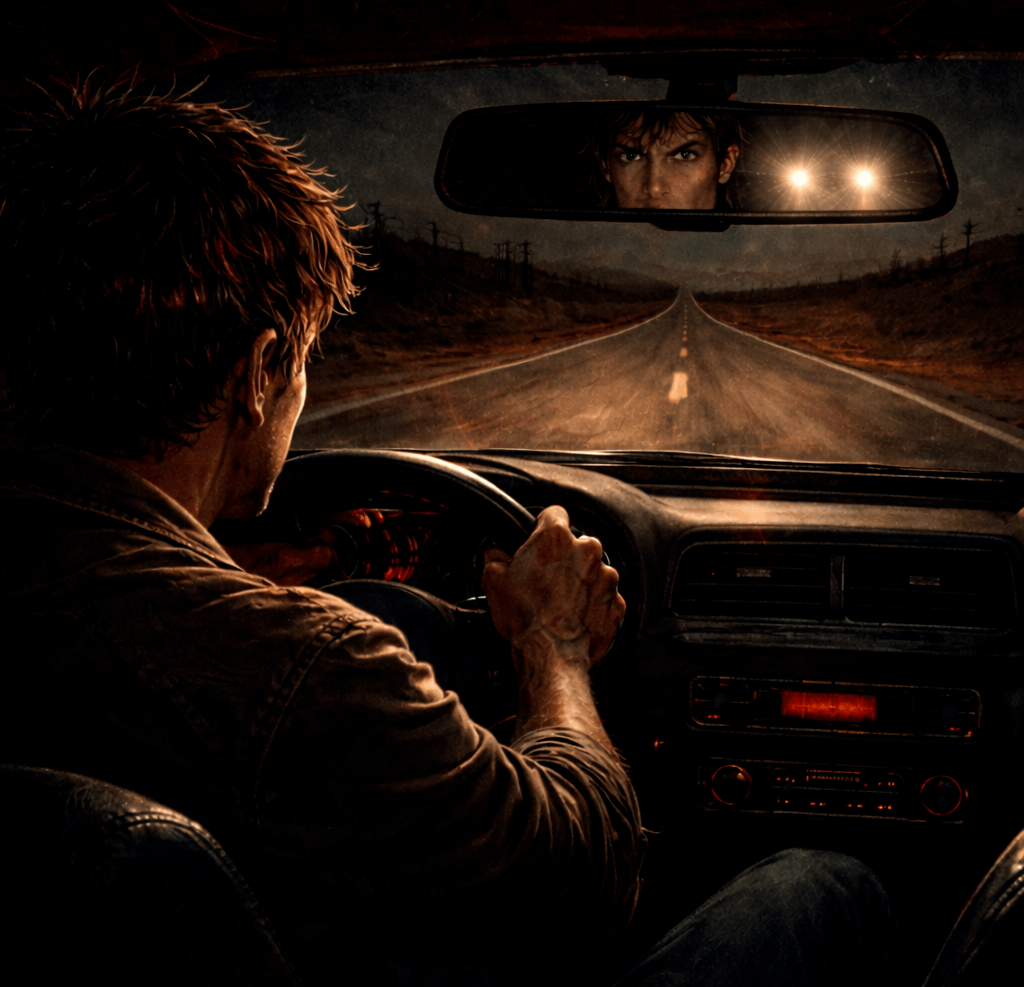 A dark desert highway at night. Two headlights in a rearview. - Drift